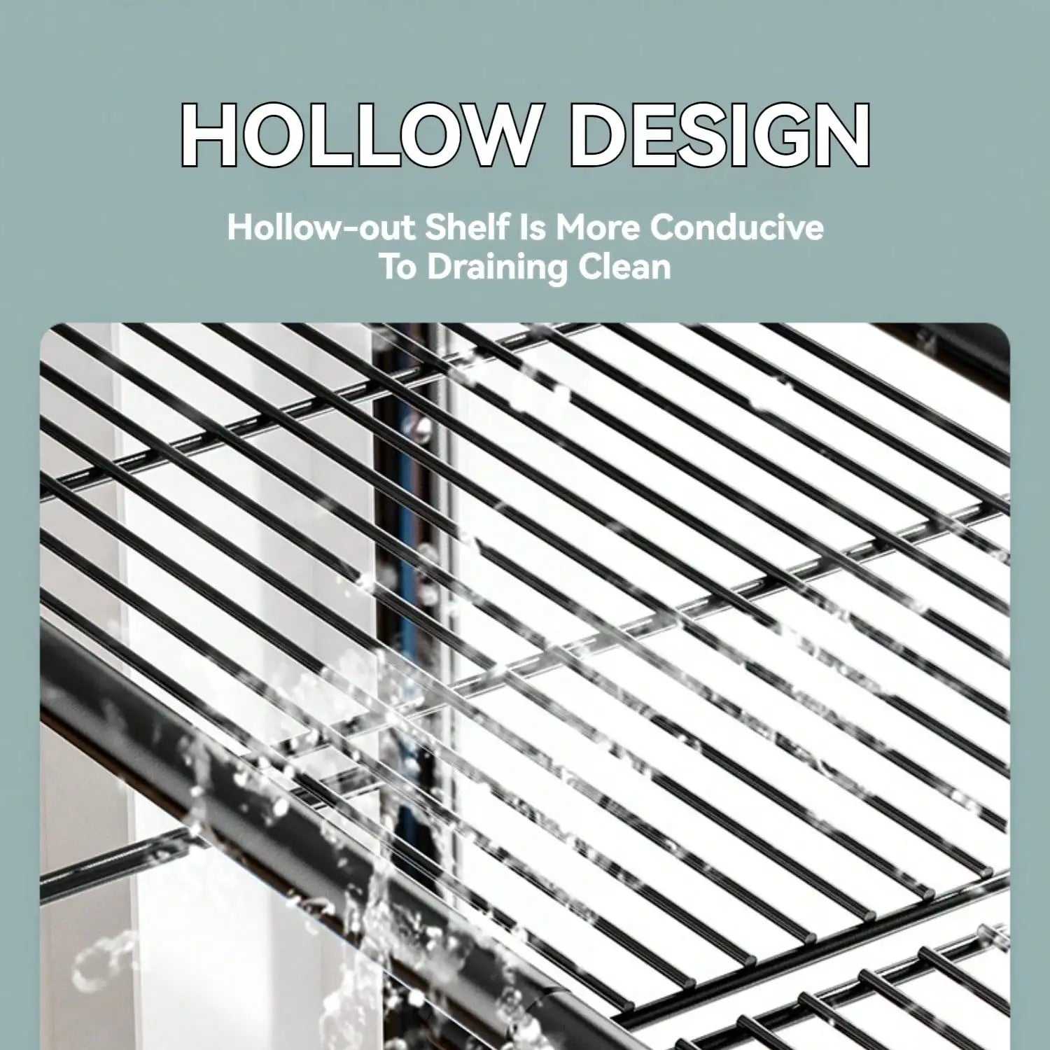 - You get a durable, anti-rust coated frame with dedicated zones—plate area, bowl area, knife holder, cutting-board rack, plus a storage basket and six hooks for tools.