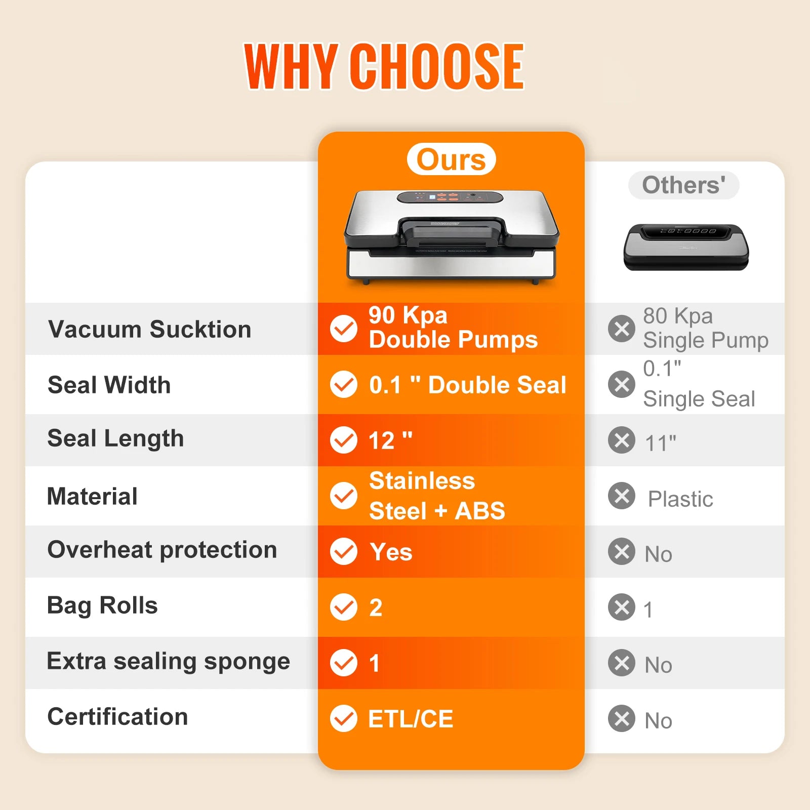- Dual 90KPa vacuum pumps and twin sealing strips deliver strong, reliable seals to prevent freezer burn while preserving texture and aroma.